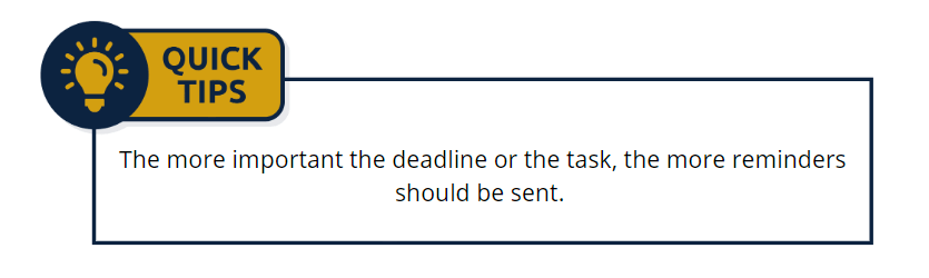 Sending too many communications can be overwhelming for the end-user, however, it's important to not let them forget important information. Send reminders for important dates, deadlines, and tasks. Use the previous points to make sure the user gets the information they need but remember to be purposeful with your communications. If end end-users need to know key pieces of information, let them know, and remind them!